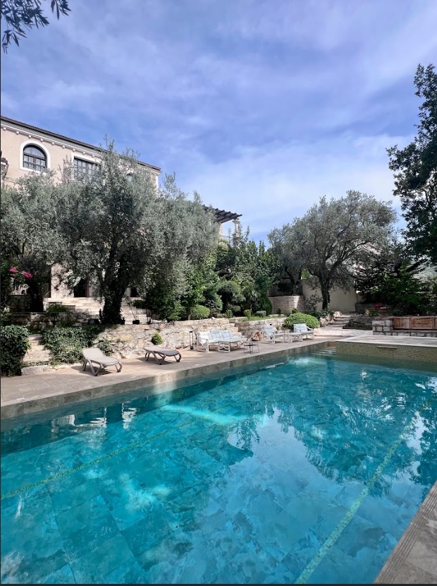 In the center of the garden, the swimming pool, made of beige stone and finished with gold mosaics, is a delight. The pool is equipped with a waterfall, countercurrent, Jacuzzi and heating, and is technically equipped to be chemical and chlorine free. A luxurious stone bench with vases and carved stone backs made of rare young marble near the pool create a magnificent ensemble. The depth of the pool allows you to enjoy both sport swimming and relaxation. The outdoor furniture near the pool is custom-made and designed to blend in with the overall atmosphere of the house.