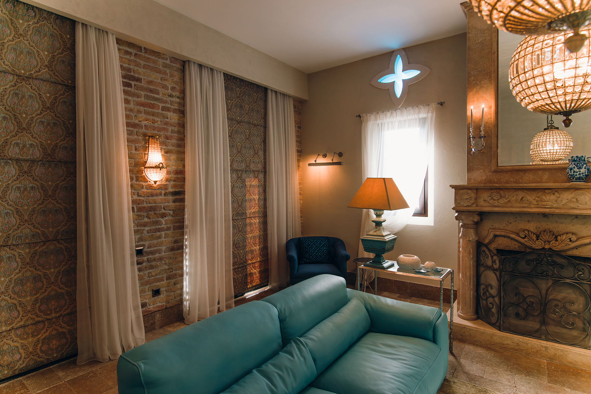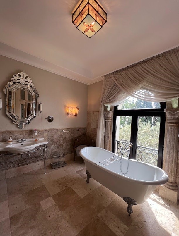 The third bedroom: is a colonially decorated space with a large bed, with a leather headboard and oriental style elements. The room also has a cozy reading alcove and an en-suite bathroom, matching the style of the bedroom with a mosaic shower and luxurious stained glass sconces.