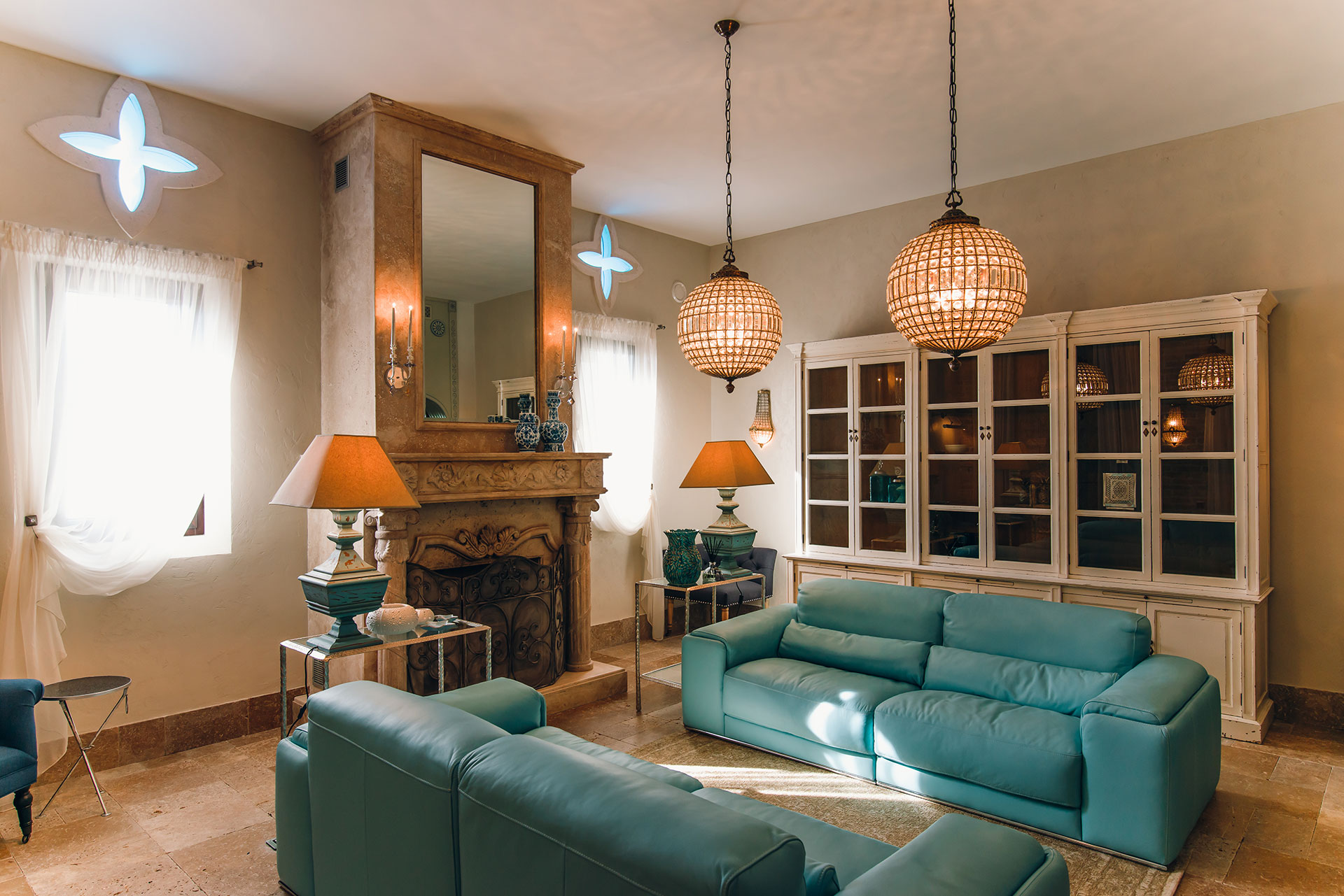 The first floor consists of an entrance hall with elevator surrounded by a wide staircase, a large closet, oriental style mirrors and armchairs. Through a carved archway we go straight to the dining room - living room from which we enter the fireplace room with soft sofas. On the other side of the dining room we can see a large sliding door decorated with stained glass and crystal glasses, behind it there is a kitchen and a toilet, as well as steps to the basement and the second exit to the patio, where the building with a hamam is located. All the first floor rooms have access to the terraces and the garden to the swimming pool.
