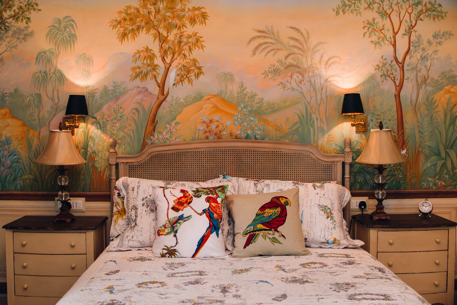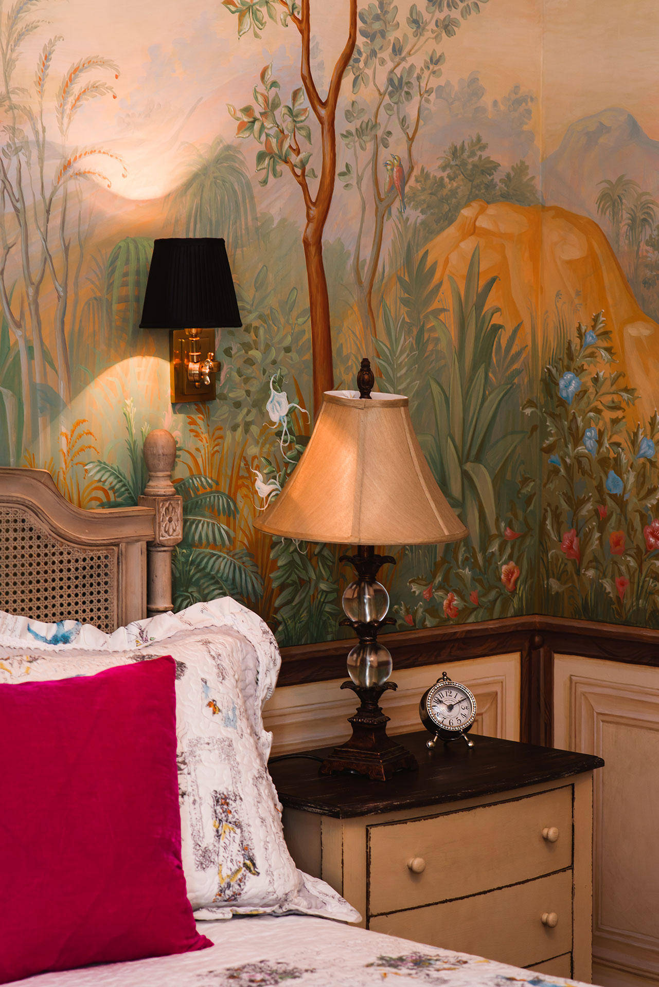 A nanny alcove, an artist's painting of a botanical garden, luxurious 18th century styling with a bronze chandelier and antique parrots, a mirrored closet, a desk by the window and a uniquely decorated bathroom create an atmosphere of luxury and comfort where every day will be a delight.