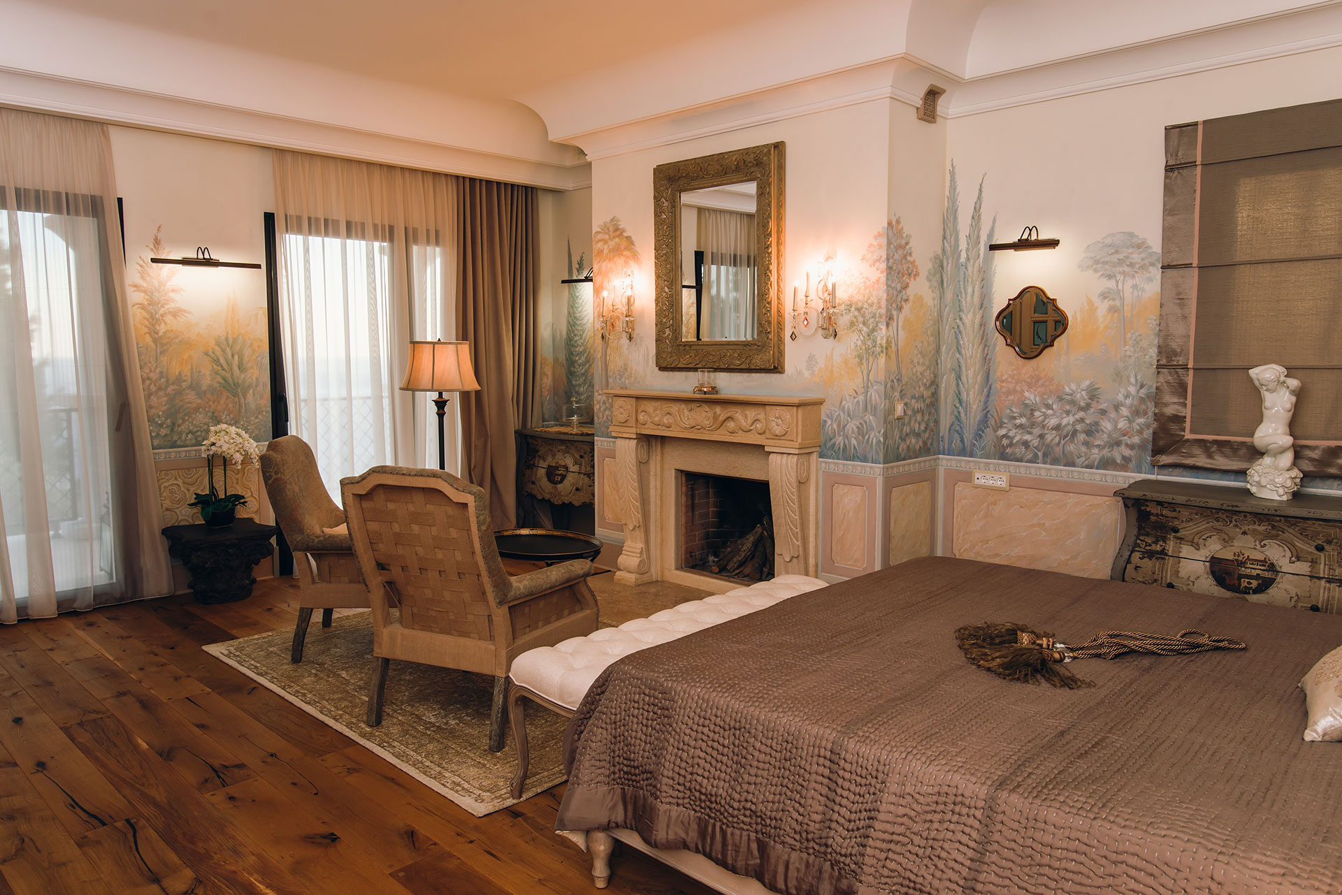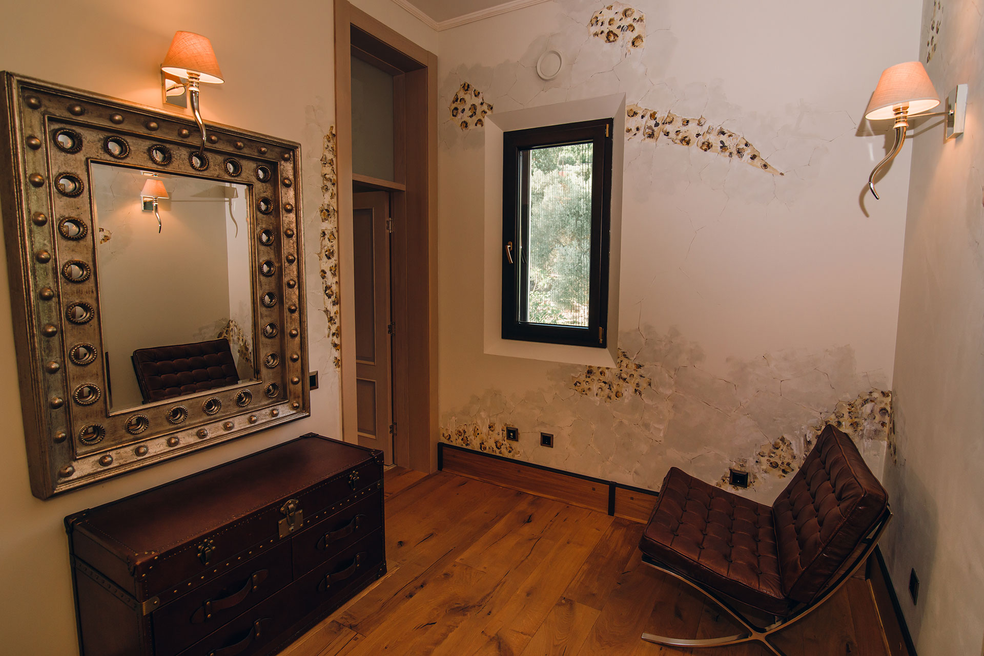 The master bedroom is the diamond of the villa. A large bedroom area, with painted walls by a famous artist, and a cozy fireplace with soft armchairs. Huge floor-to-ceiling windows with access to the terraces overlooking the endless sea. From the terrace, on the view of a relic grove of olives, the neighboring villages and cypresses, enclosing the villa and creating a magnificent ensemble created by nature, the sea, cypresses, grove, pool in the yard.