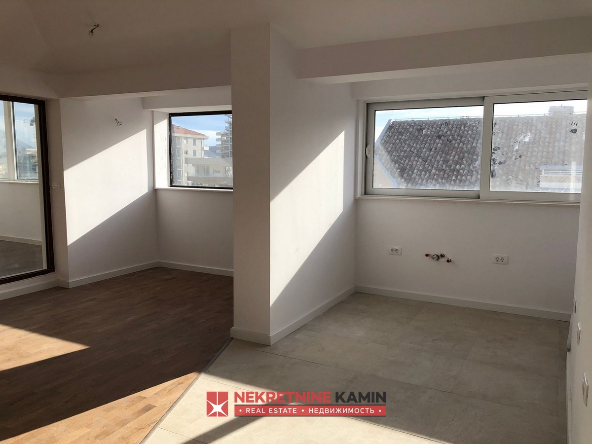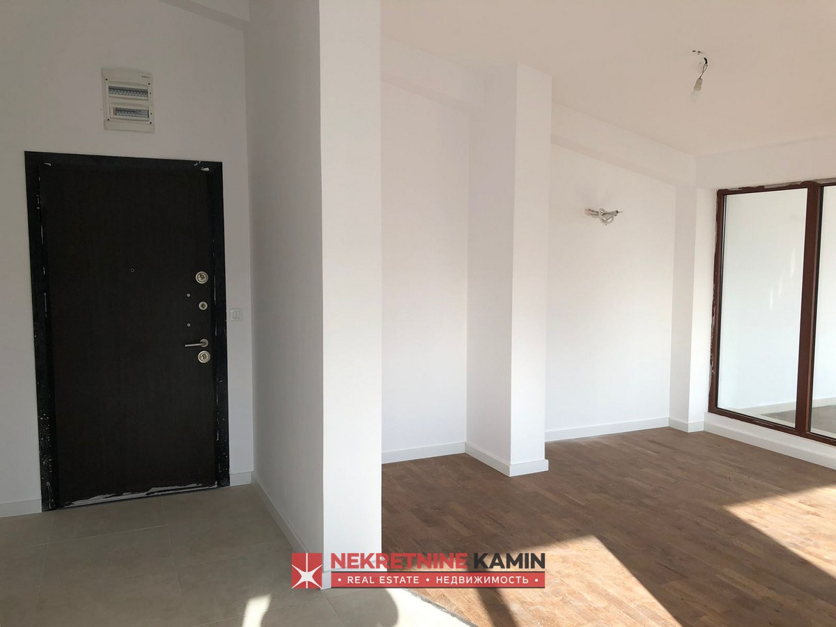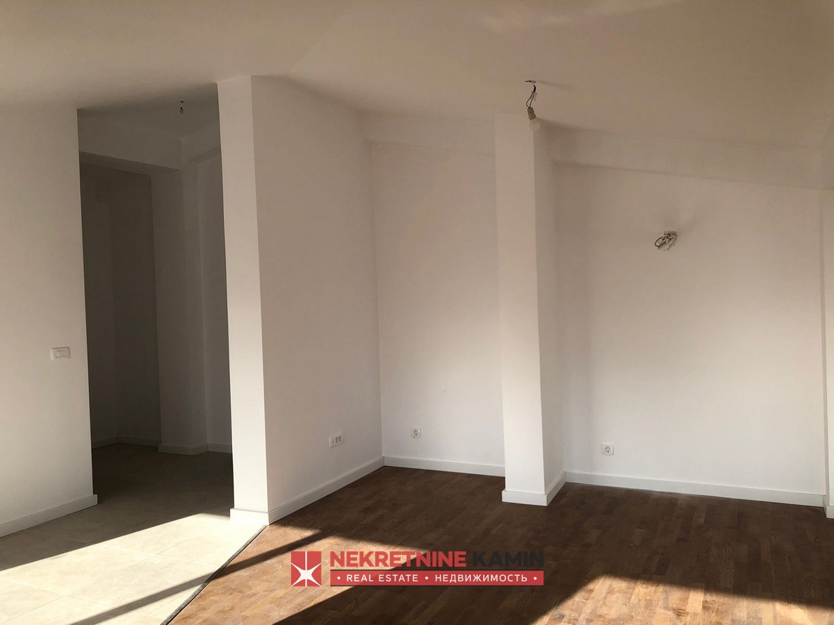 Rasporedjen je na hodnik, dnevni boravak sa kuhinjom i trpezarijom, dvije spavaće sobe,kupatilo i velika zastakljena terasa.