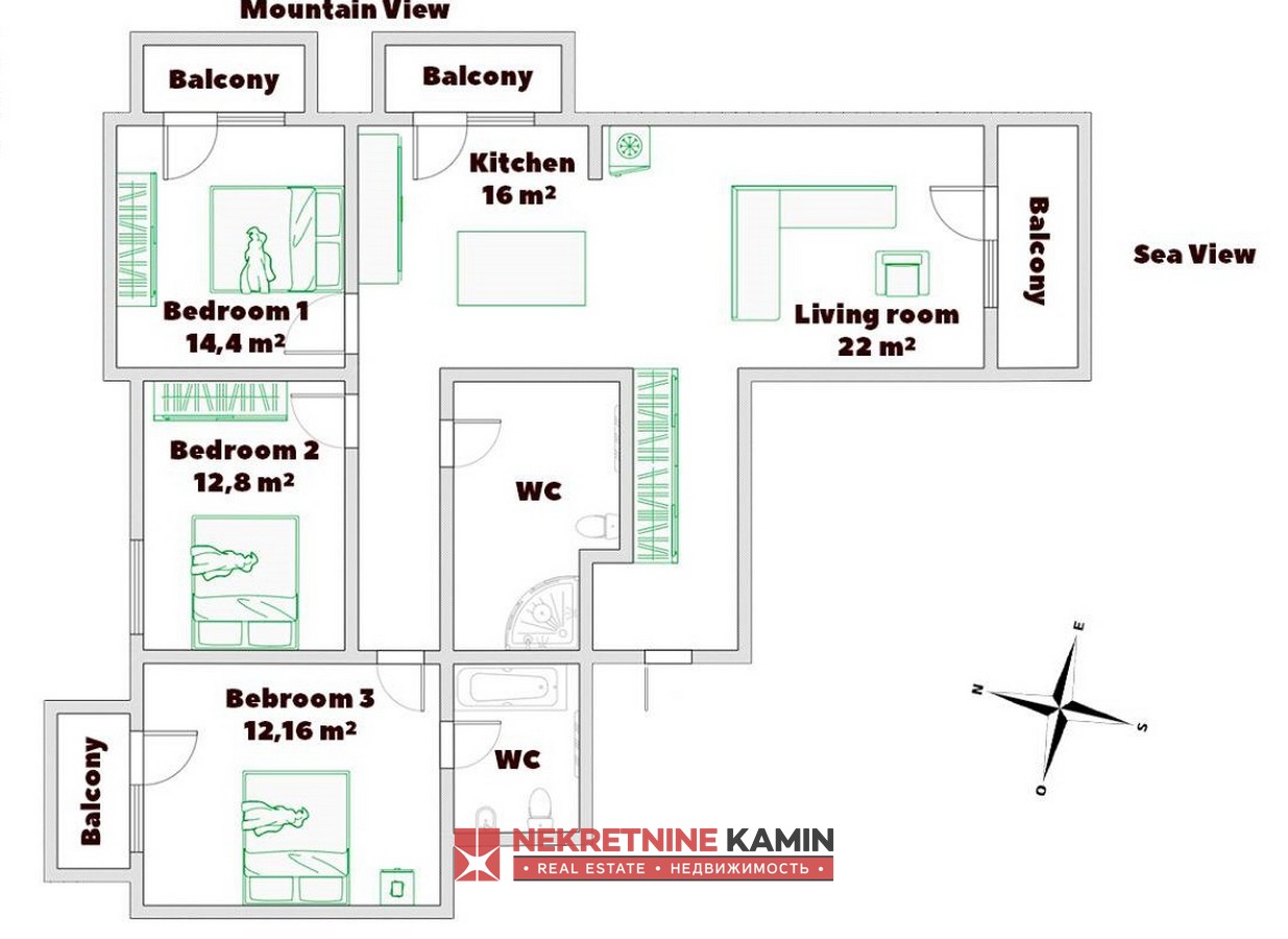 Nalazi se na trećem spratu stambene zgrade sa liftom i sastoji se iz hodnika,tri spavaće sobe od kojih jedna ima lično kupatilo,još jednog kupatila,dnevnog boravka sa kuhinjom i trpezarijom i četiri balkona.