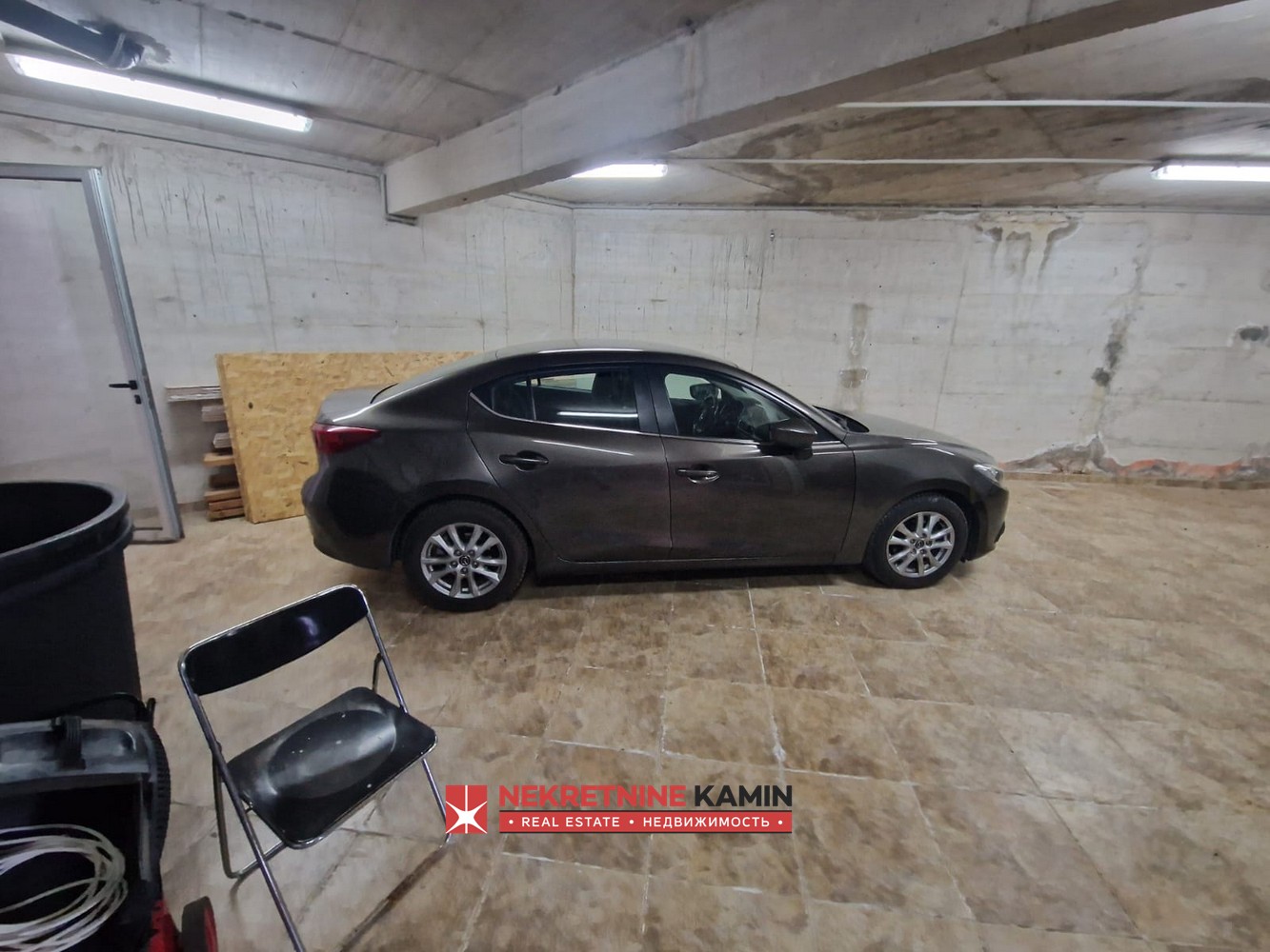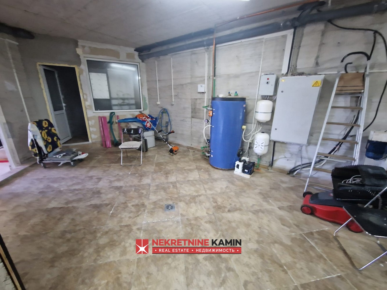 Suteren kuće prostire se na 130m2 i obuhvata tri garažna mesta, poslovni prostor od 23m2 s direktnim ulazom s ulice, te prostor za agregat od 6m2.