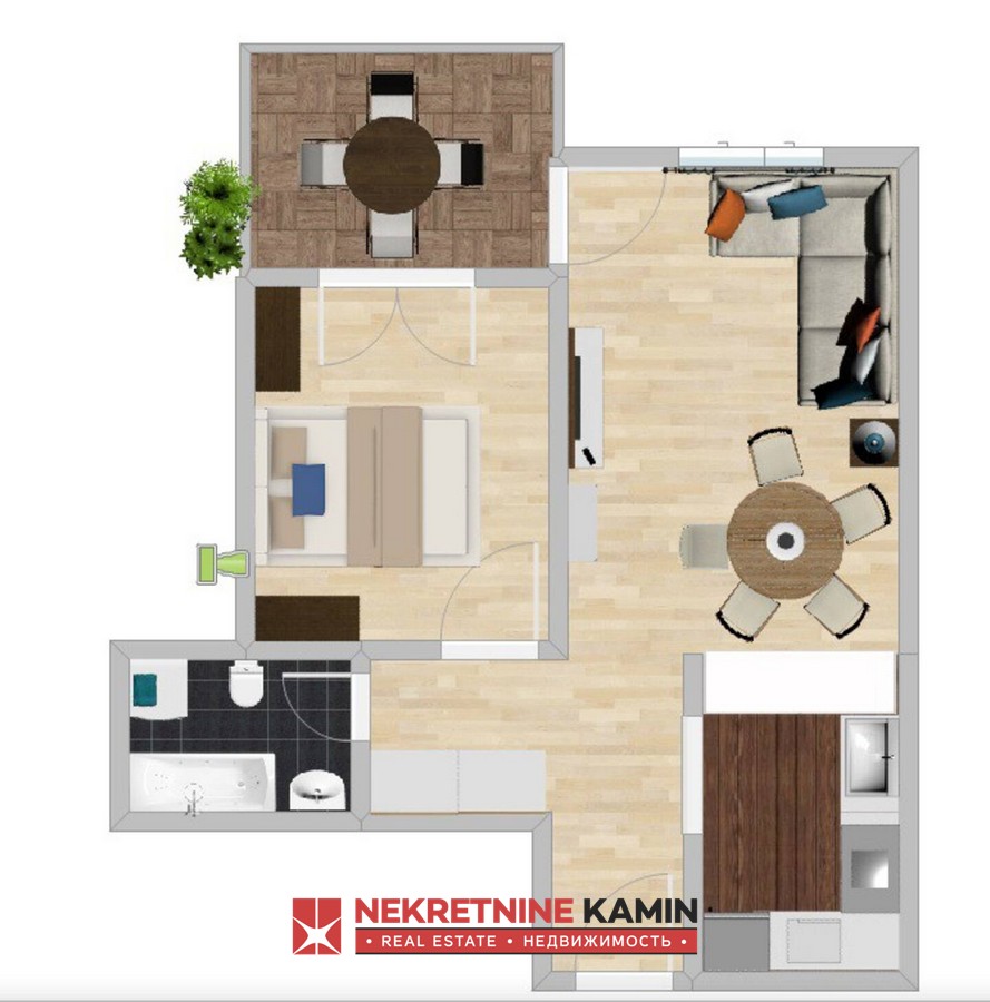 Sastoji se od predsoblja, dnevne sobe s trpezarijom i otvorenom kuhinjom, spavace sobe i terase.