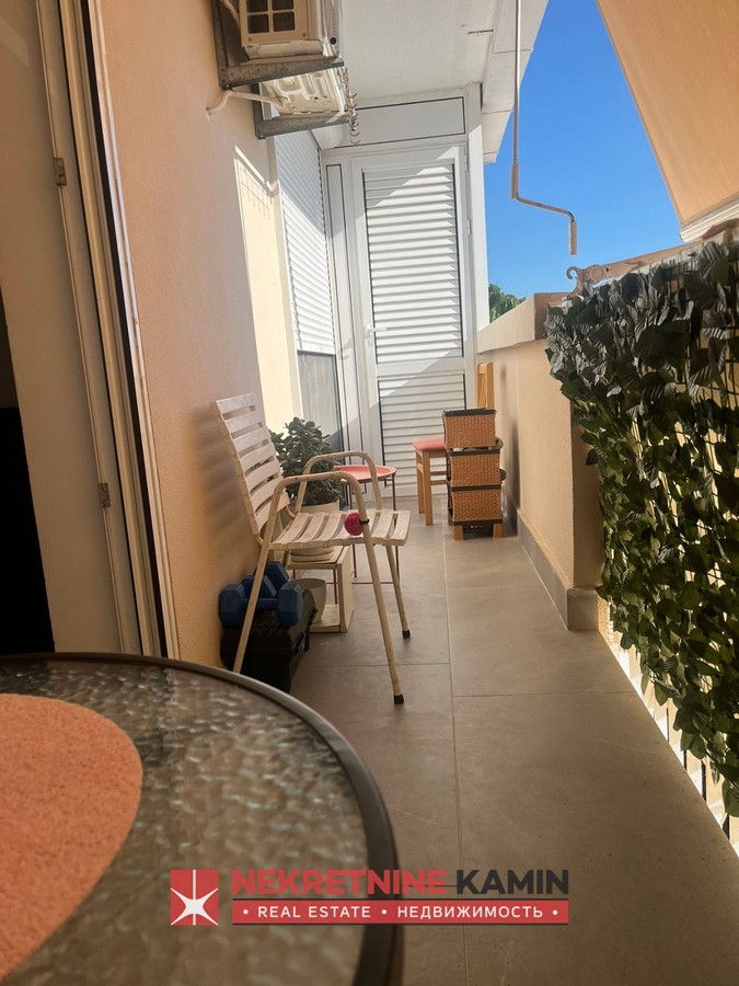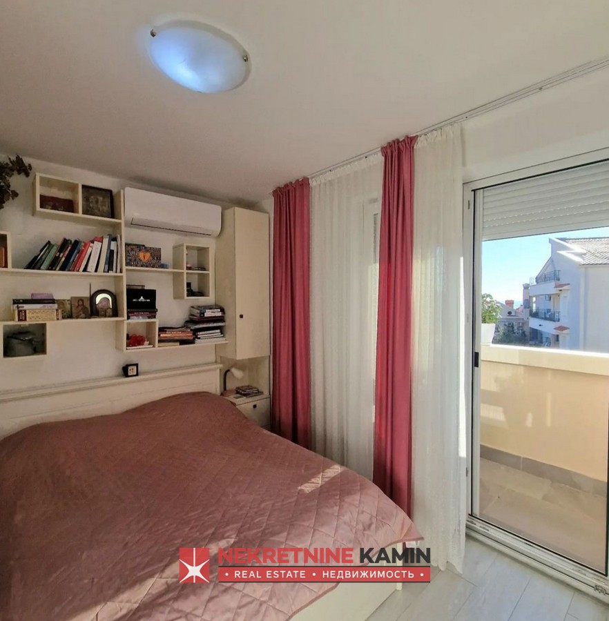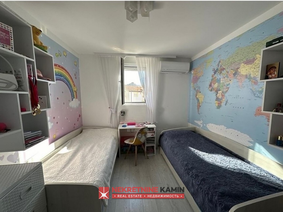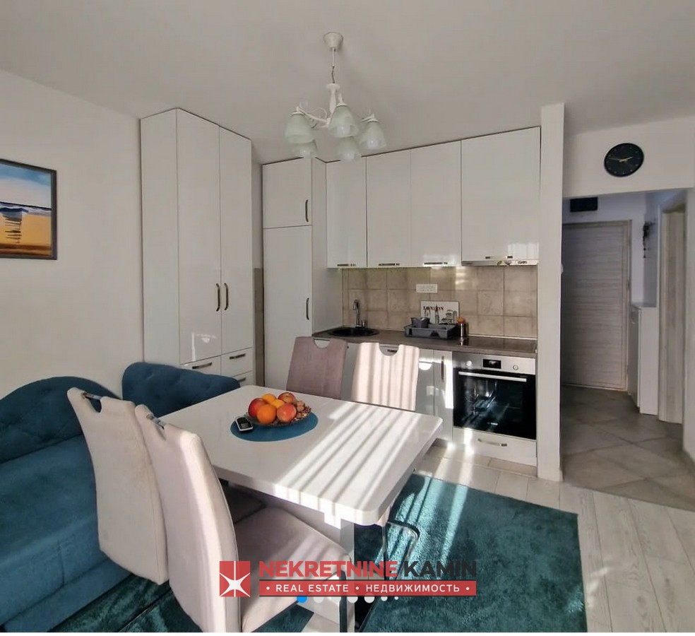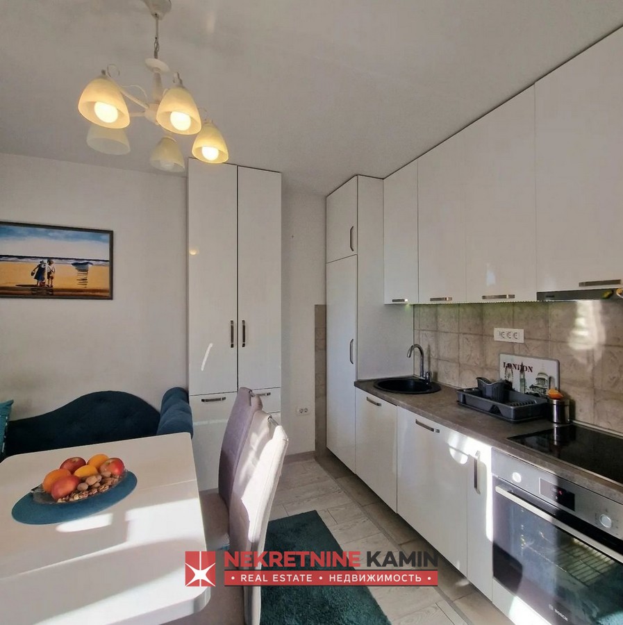 Kompletno je opremljen namještajem po mjeri i bijelom tehnikom.