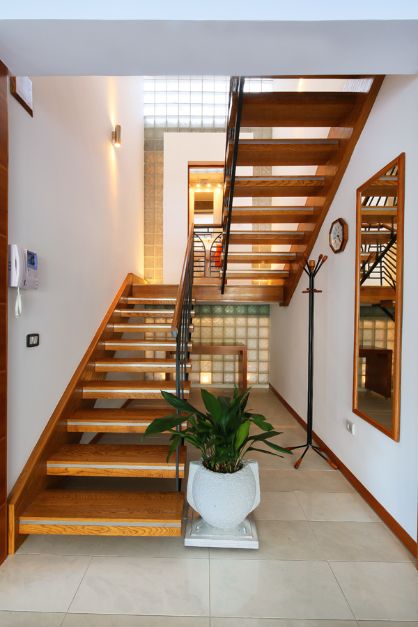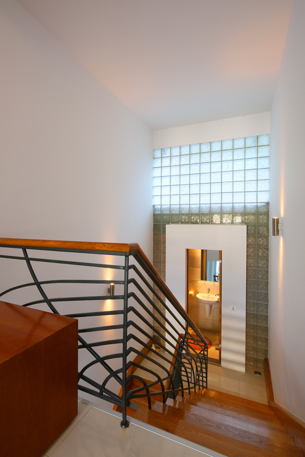 -Na prvom spratu se nalazi bazen (9mx4m) sa zelenoplavim mozaikom, plato oko bazena pokriven kamenim pločama, dnevna soba sa trpezarijom odvojena od velike natkrivene terase staklenim zidovima/panelima za pomeranje, kuhinja, ostava, soba, kupatilo, stepenište za II sprat, WC sa spoljnim ulazom, tuš pored bazena sa toplom vodom.