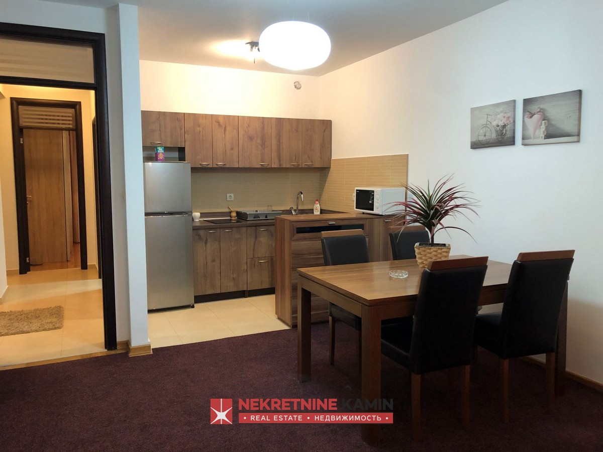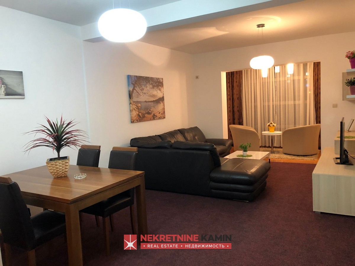 Kompletno je opremljen namještajem po mjeri i bijelom tehnikom.