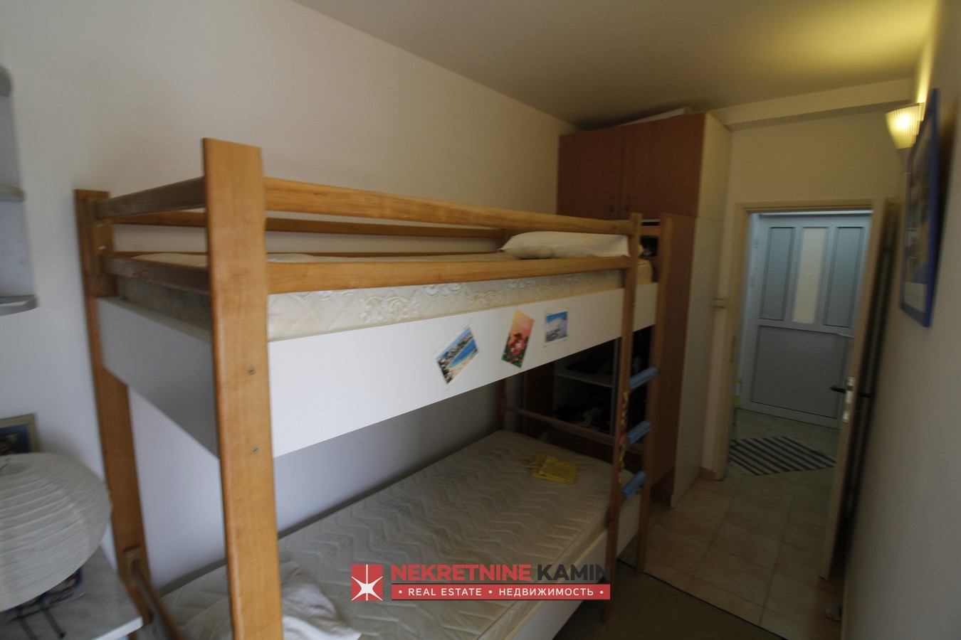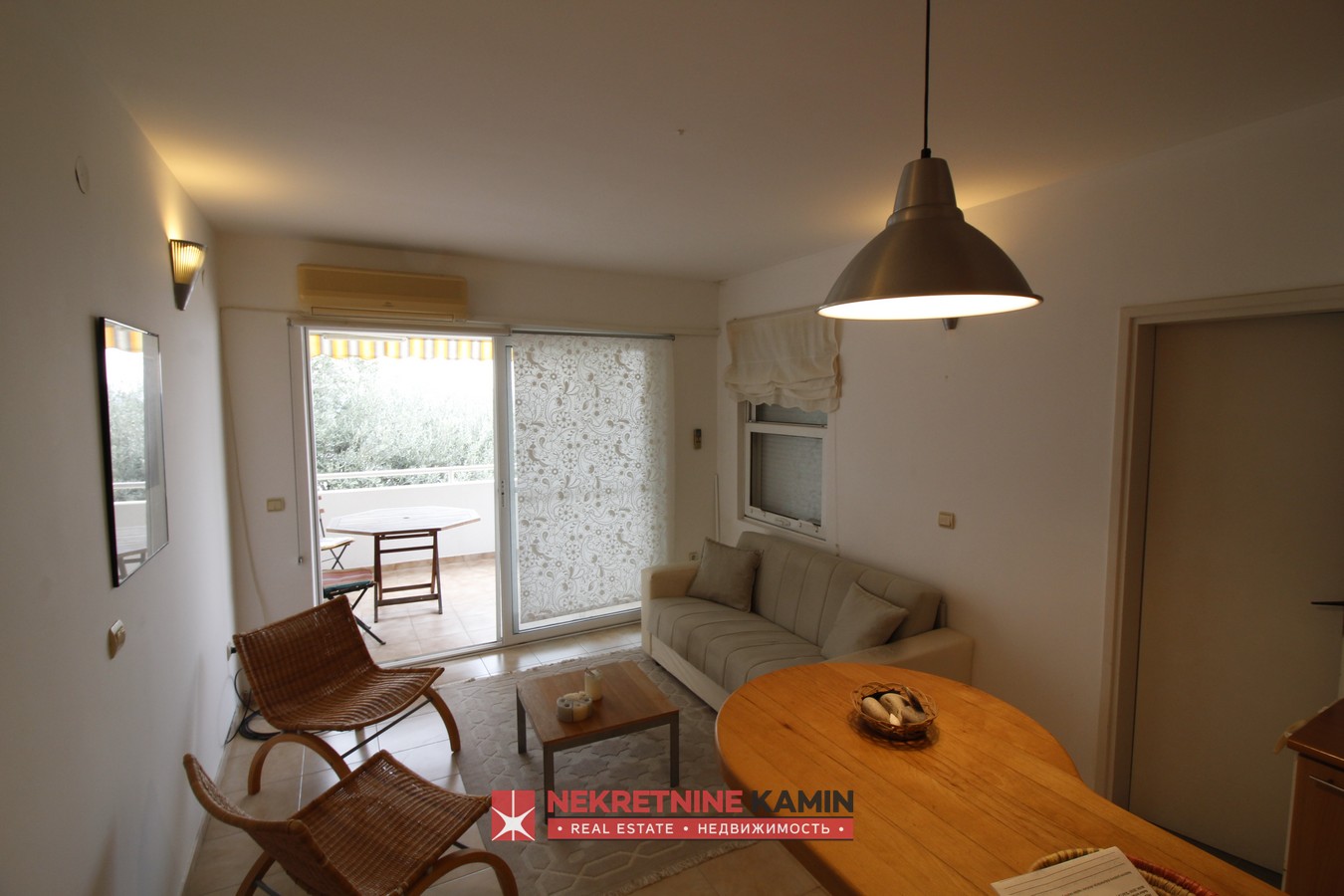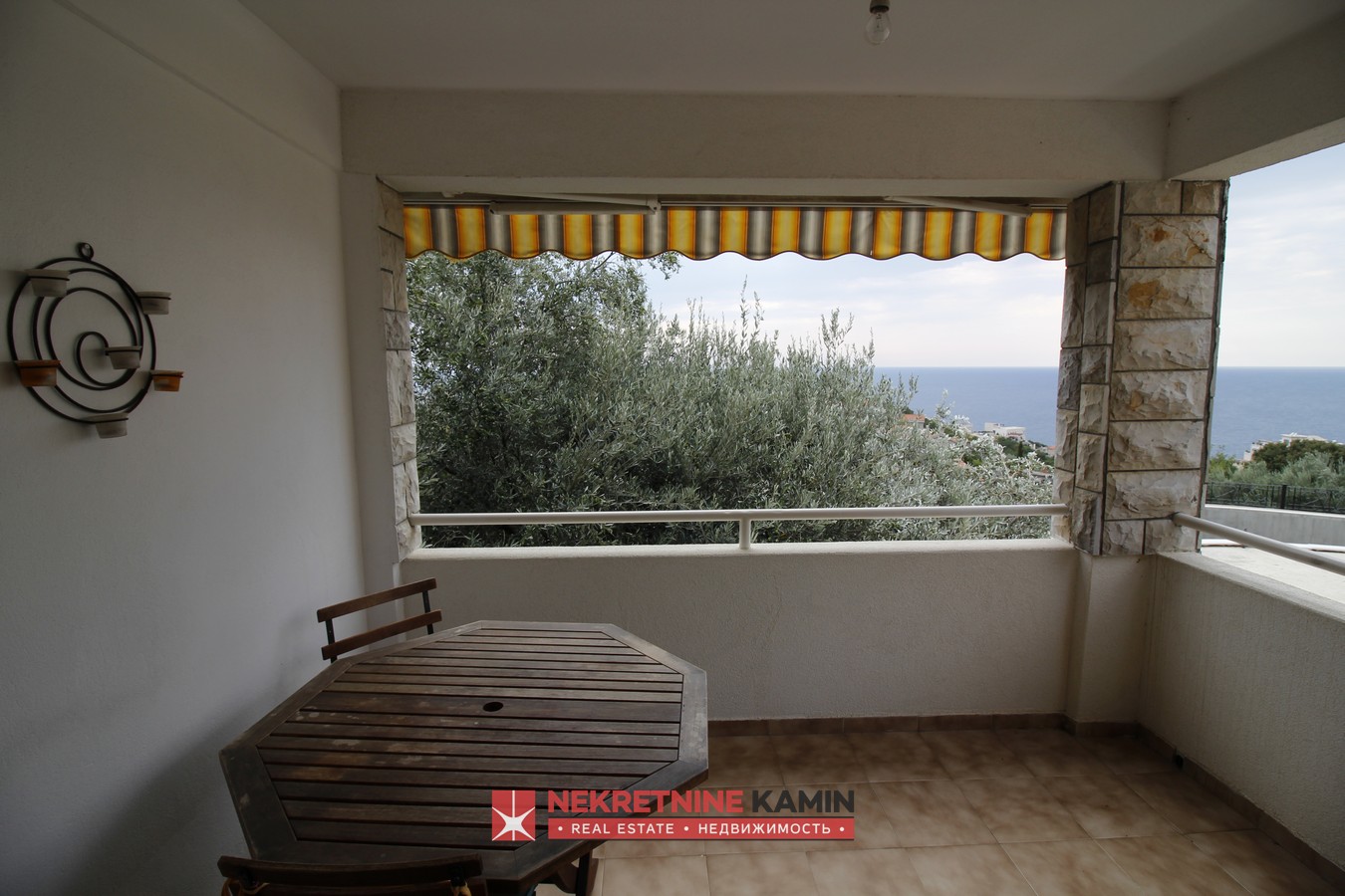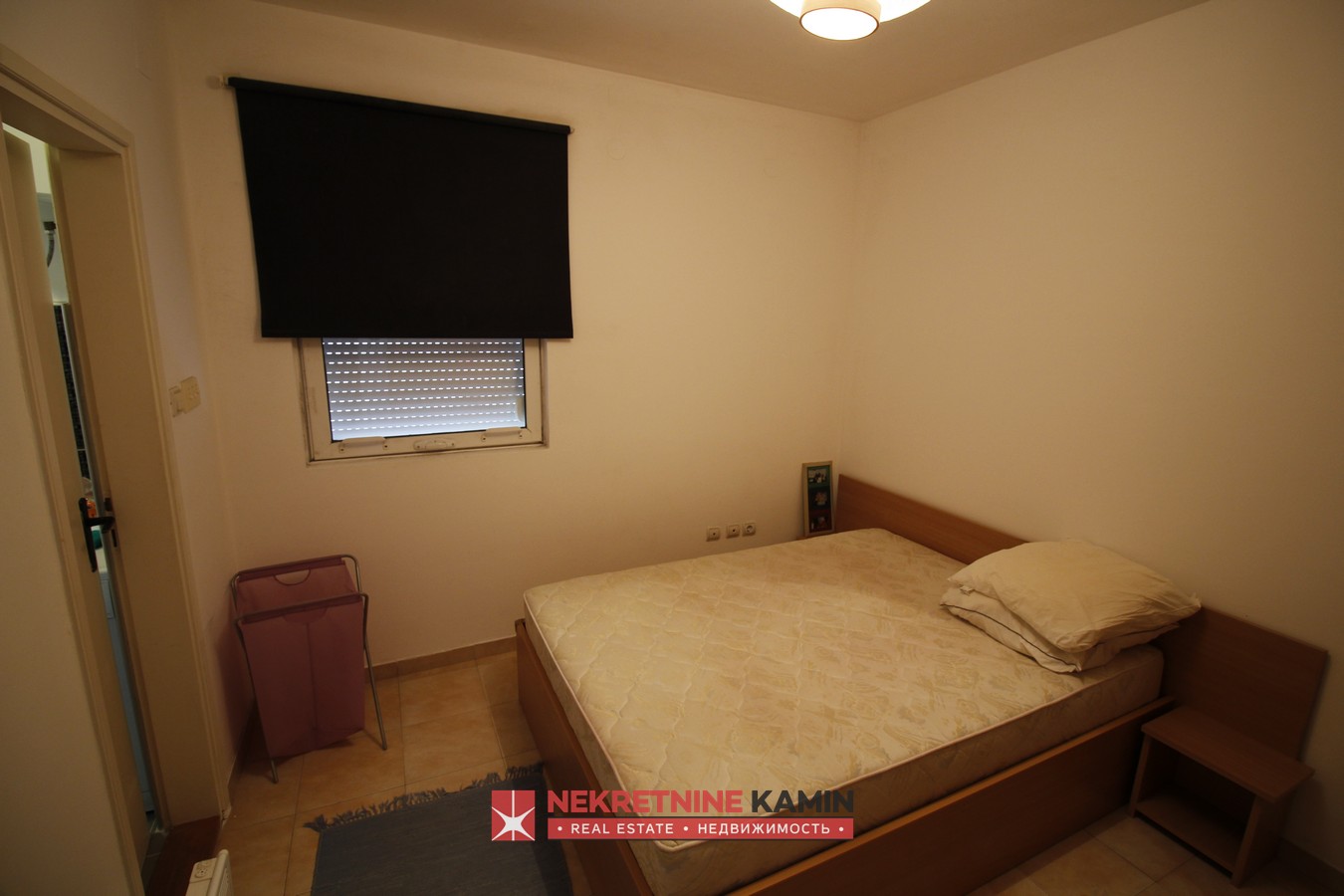 Stan se nalazi u maloj stambenoj zgradi (svega 5 apartmana) na prvom spratu. Sastoji se od hodnika, dnevnog boravka sa izlaskom na prelijepu terasu otvorenog pogleda na more, dvije spavaće sobe od kojih manja ima mali balkon, kupatilo komplet renovirano.