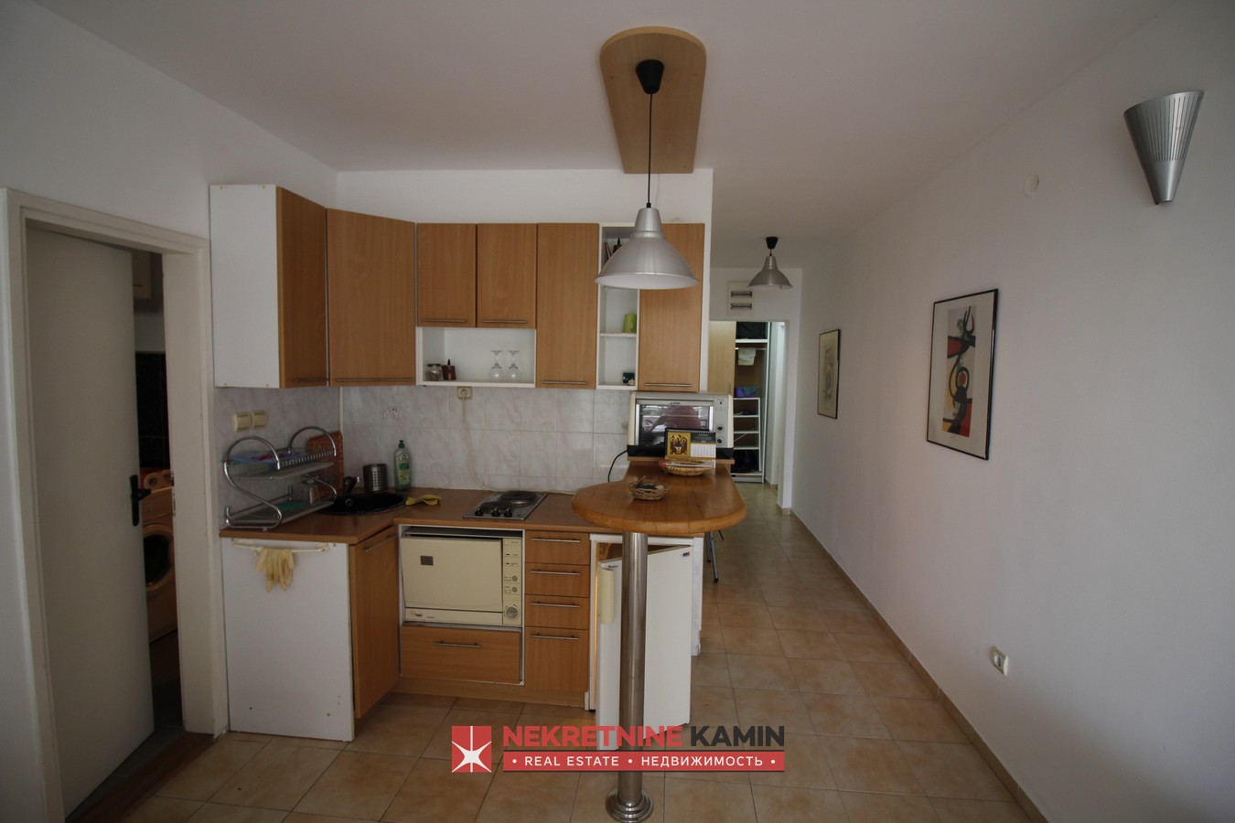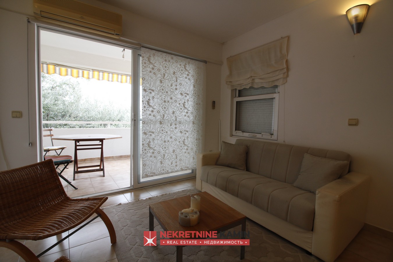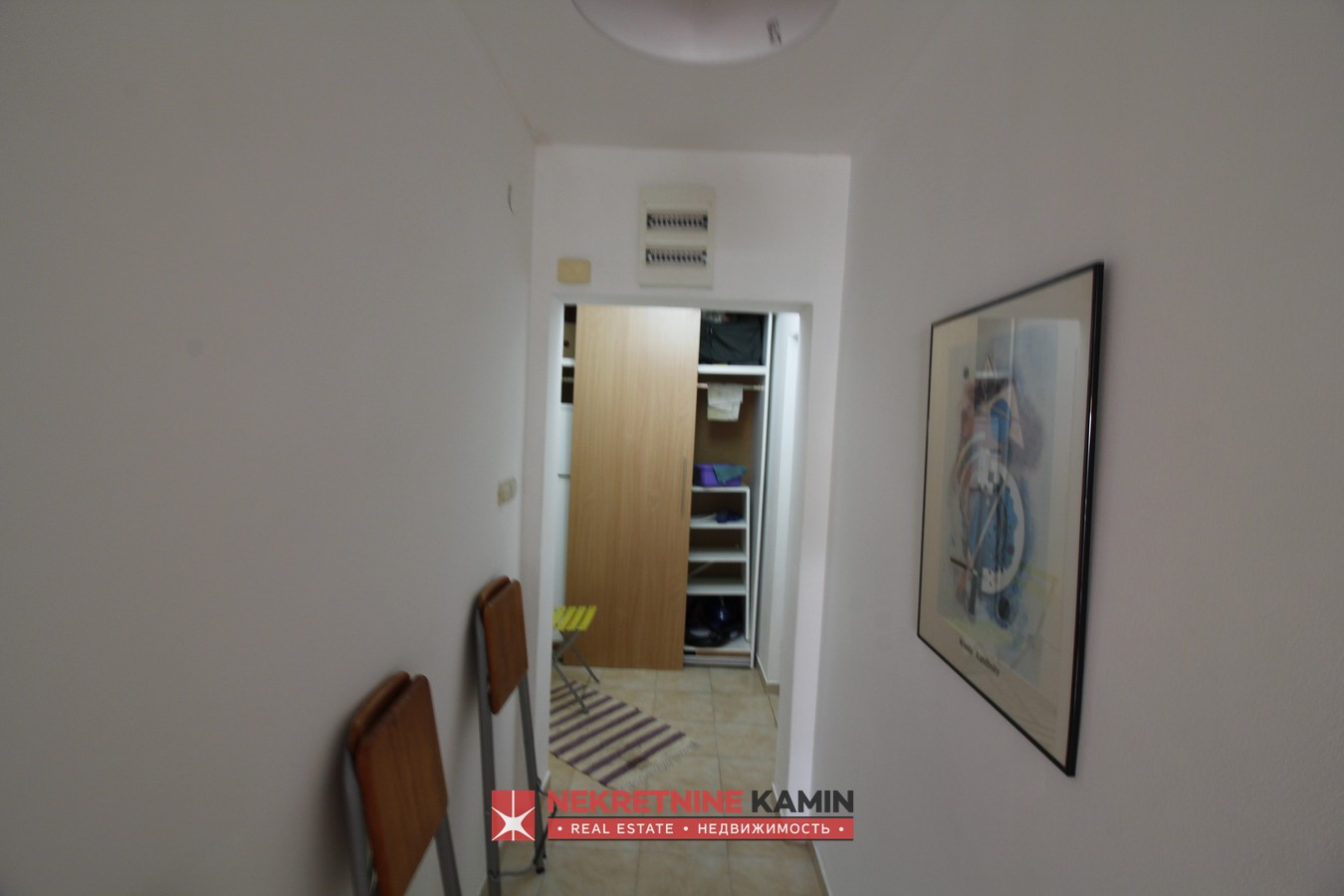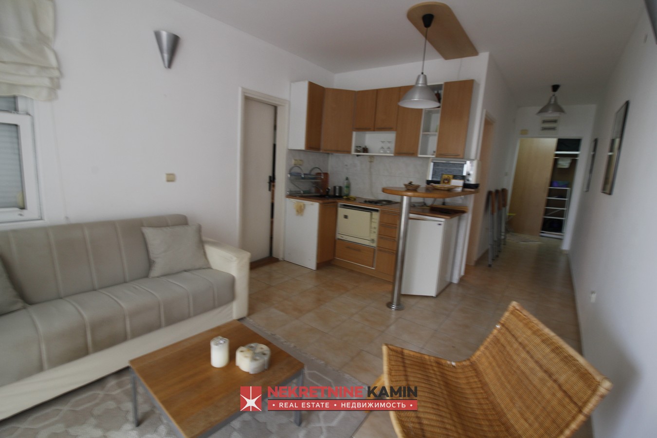 Stan se nalazi u maloj stambenoj zgradi (svega 5 apartmana) na prvom spratu. Sastoji se od hodnika, dnevnog boravka sa izlaskom na prelijepu terasu otvorenog pogleda na more, dvije spavaće sobe od kojih manja ima mali balkon, kupatilo komplet renovirano.