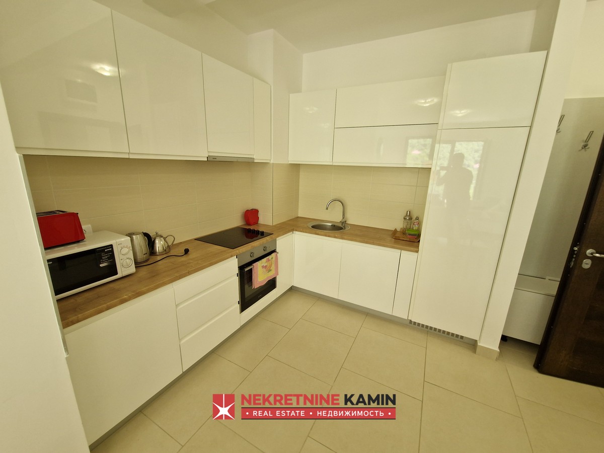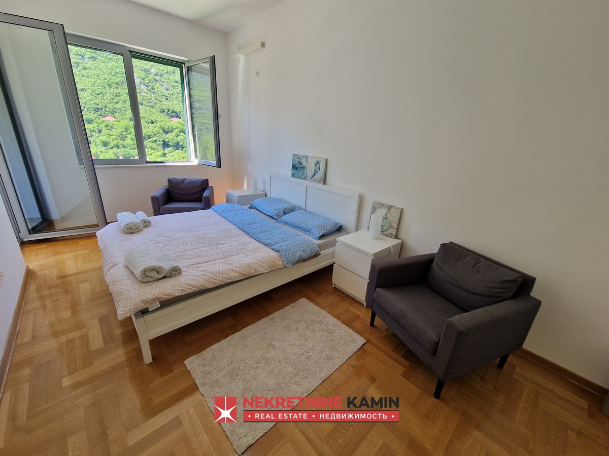 Stan zauzima površinu od 58 m2 sa čije se terase pruža otvoren pogled na zelenilo i djelimičan pogled na more.