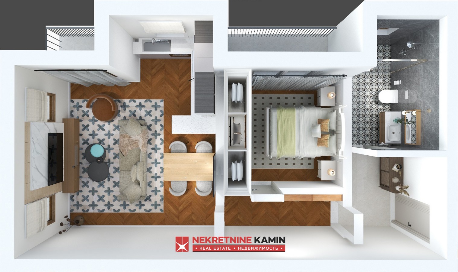 Jednosobni stanovi na prodaju su površine od 48m2 do 59m2 i sastoje se od dnevnog boravka sa kuhinjom i trpezarijom kao “open space“, spavaće sobe, kupatila i terase.