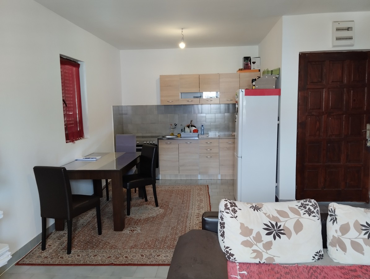 Rasporedjen je na dnevni boravak sa kuhinjom i trpezarijom, spavaćom sobom, kupatilom i terasom.