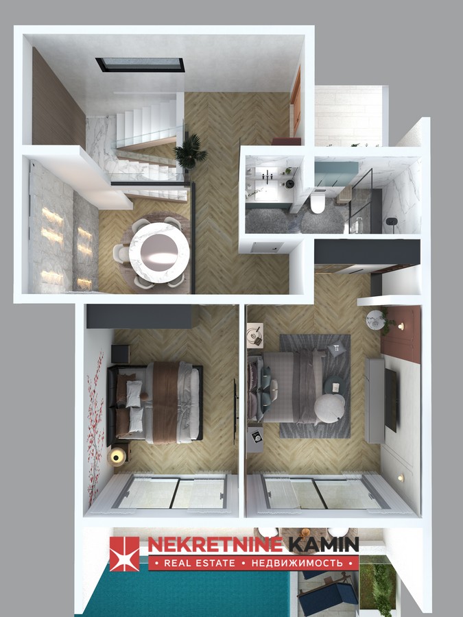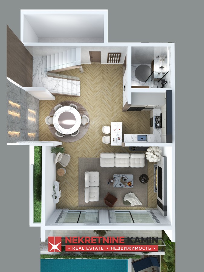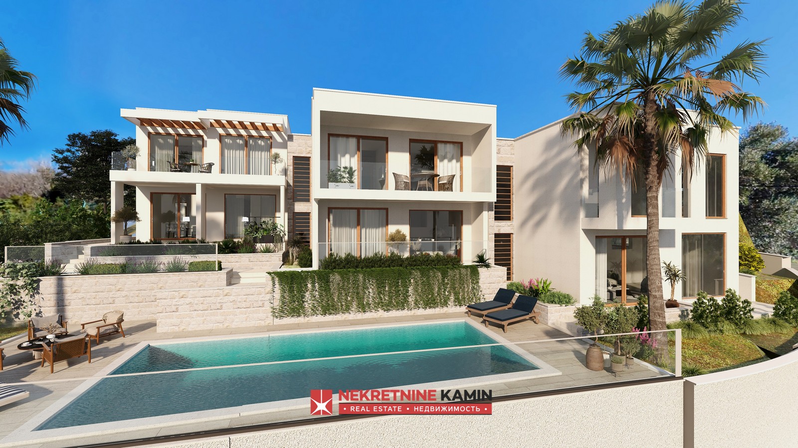 Svaka od vila je predvidjeno da ima po 250m2 ( prizemlje i prvi sprat) i po dva parking mjesta, a kao zajednički sadržaj za sve tri vile je spoljašnji bazen.