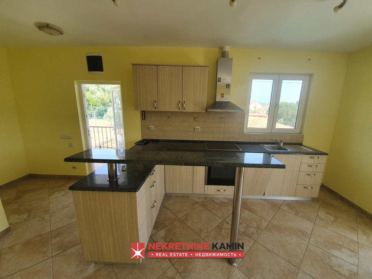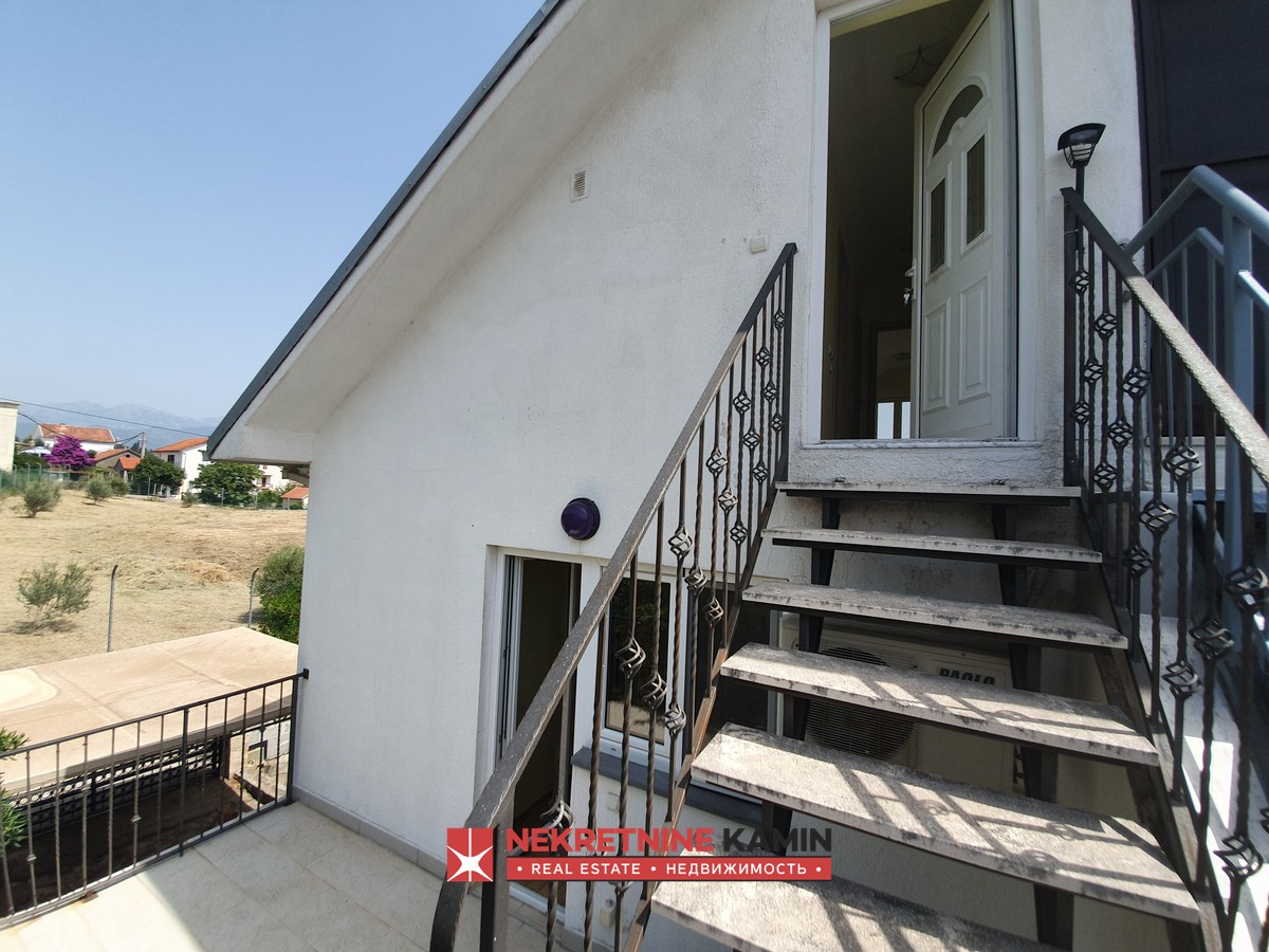 Do prvog sprata dolazi se vanjskim stepenicama i na tom spratu se nalazi velika kuhinja sa trpezarijom, dnevni boravak, kupatilo i izlaz na balkon.