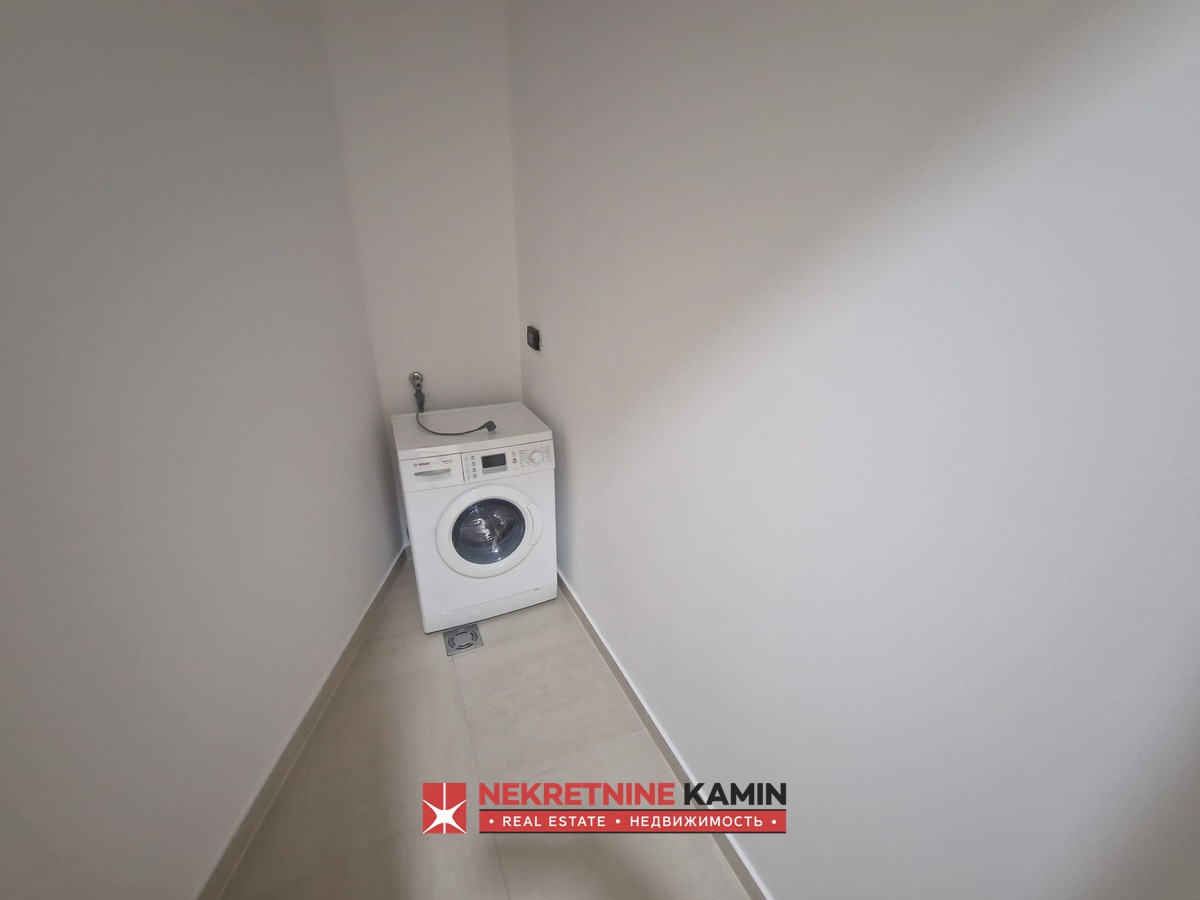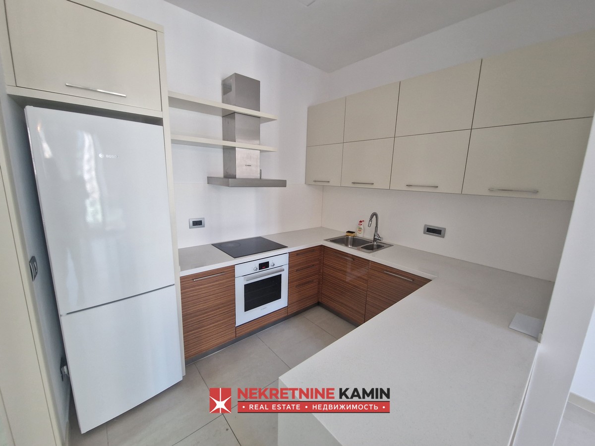 Rasporedjen je na dnevni boravak, kuhinju, spavaću sobu, dva kupatila, ostavu i veliku terasu sa koje se pruža djelimičan pogled na more.