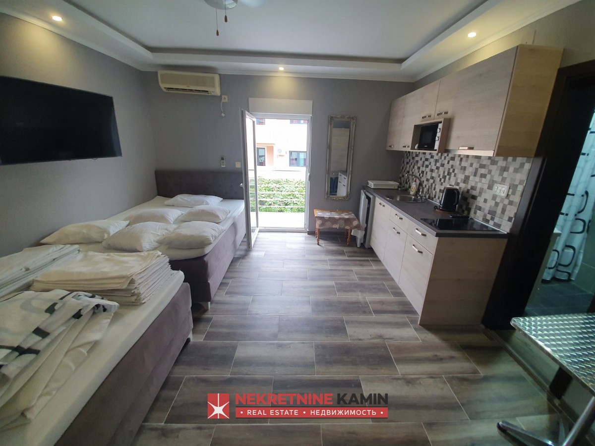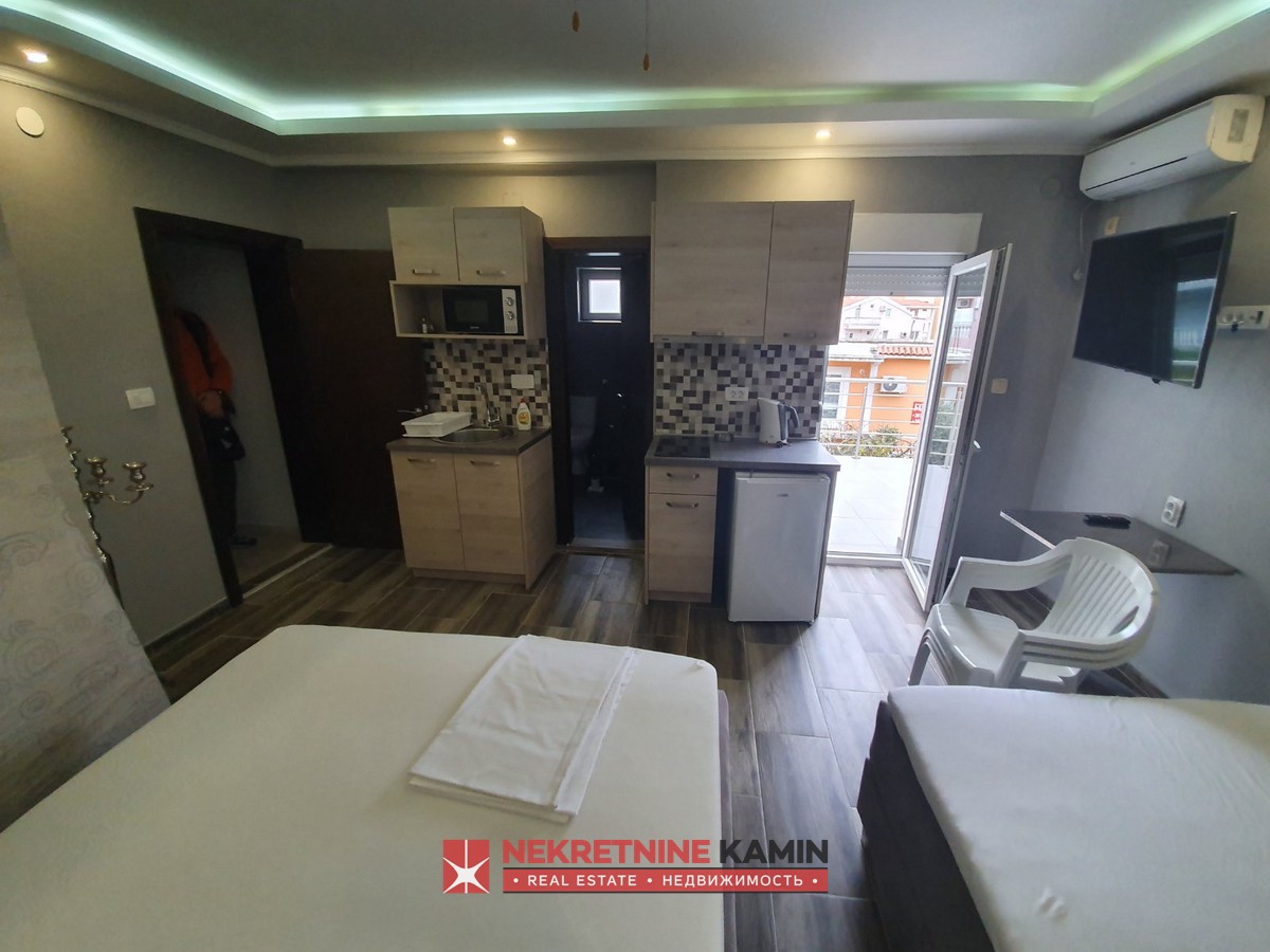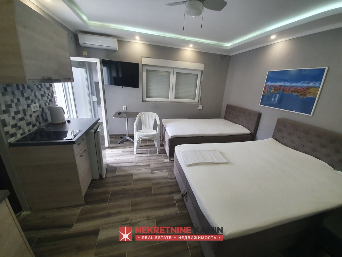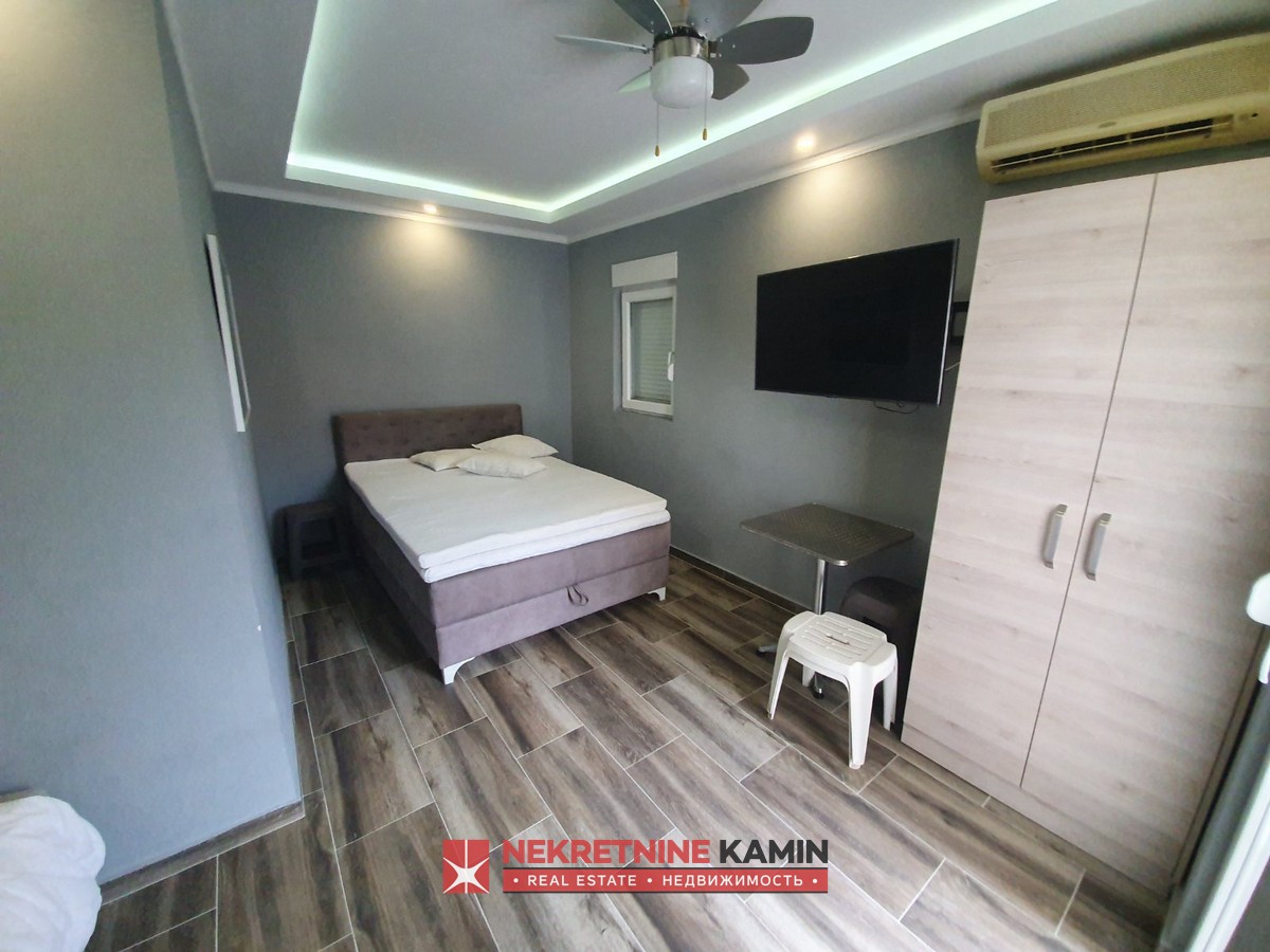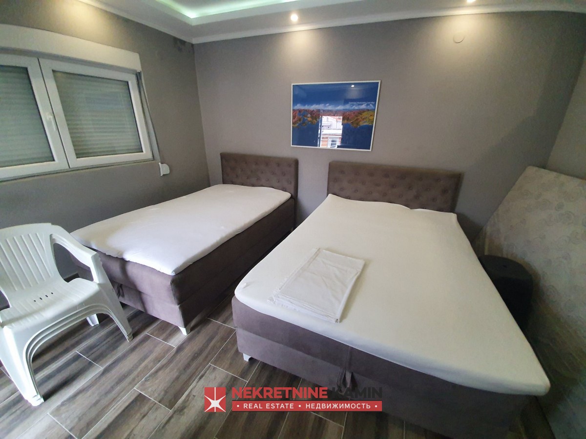 Na prvom spratu se nalazi dvosoban stan u fazi renoviranja a na drugom su tri opremljena apartmana sa terasama.